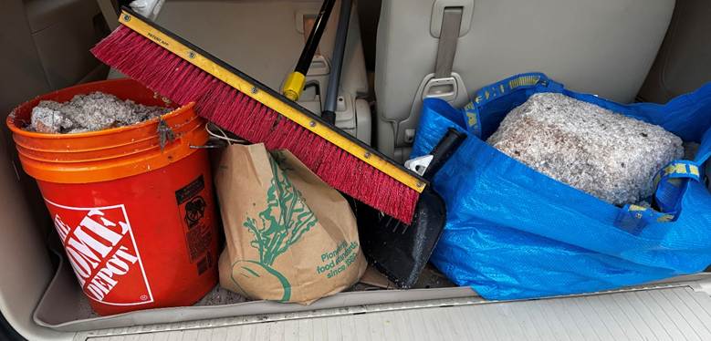 As the rain began to fall, Kaimy needed more supplies and assistance to get the job done. Kaimy reached out to the network, and fellow Salt Watcher Bruce Adams dropped his dinner plans to help. Working together in the rain, they managed to fill five large trash bags with salt that would have otherwise ended up in local streams.