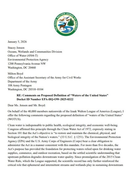 The Izaak Walton League of America strongly opposes the proposed revision to the definition of “Waters of the United States,” arguing that it would significantly weaken Clean Water Act protections…