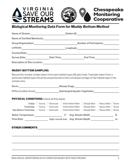 The datasheet to fill out while taking a VA SOS Muddy Bottom sample.