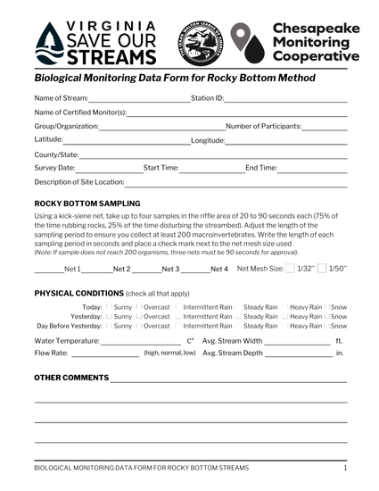 The datasheet to fill out while taking a VA SOS Rocky Bottom sample.