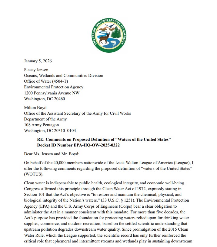 The Izaak Walton League of America strongly opposes the proposed revision to the definition of “Waters of the United States,” arguing that it would significantly weaken Clean Water Act protections…