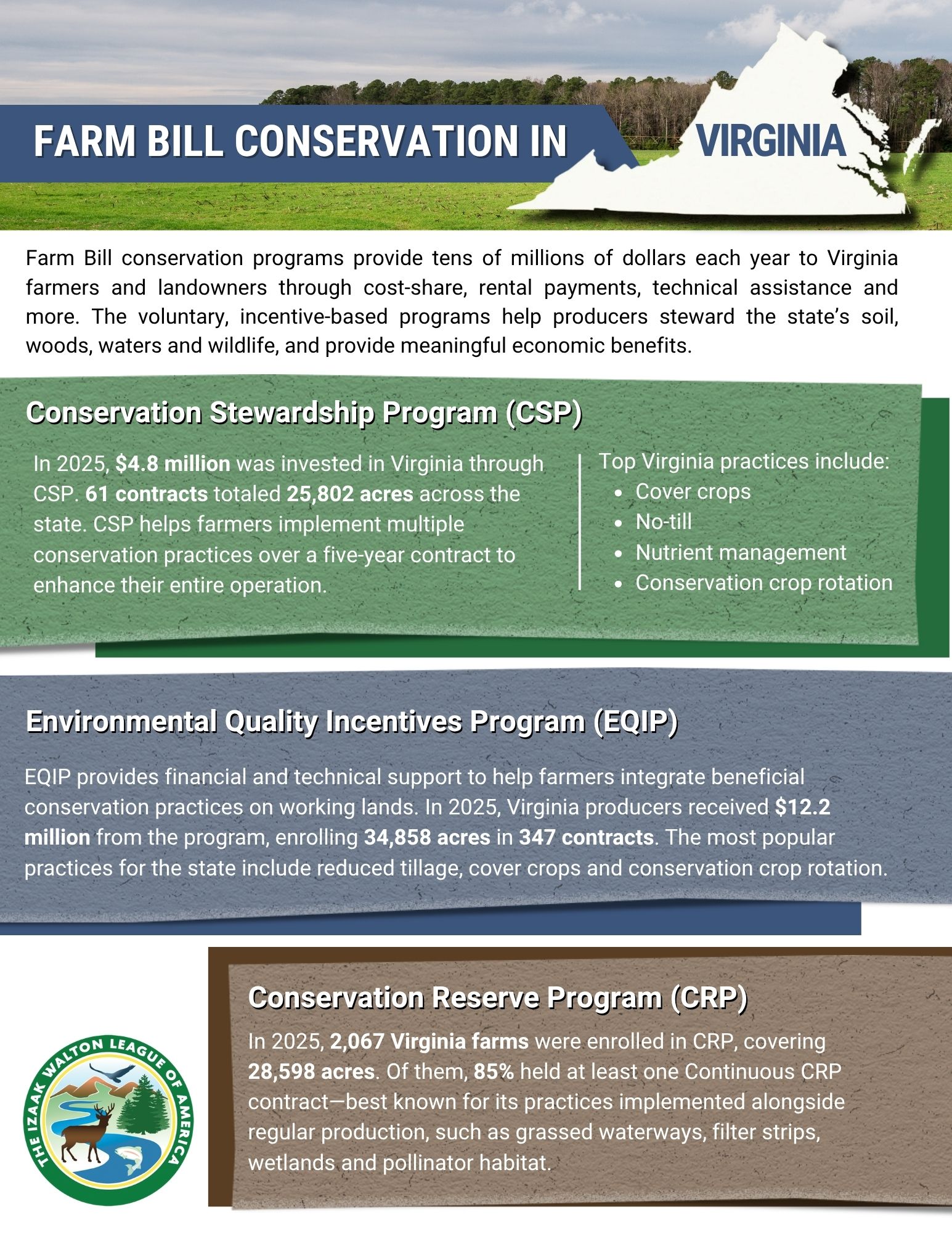 Federal conservation programs established in the Farm Bill are some of our nation’s strongest tools to increase conservation practices that improve water quality, bolster soil health, improve wildlife habitat and more. Learn more about key program impacts in Virginia.