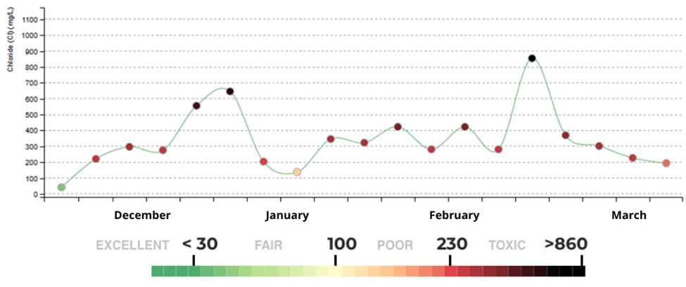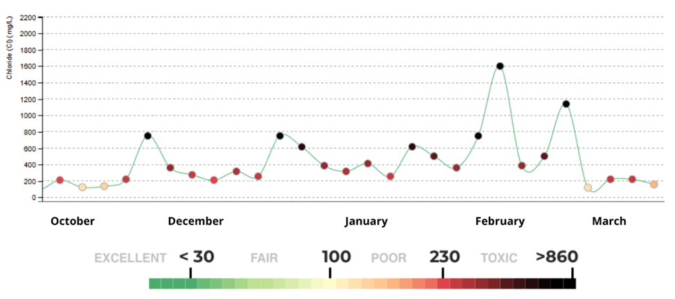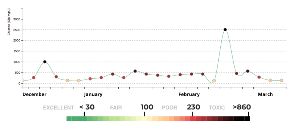 In the Washington, D.C., Maryland and Virginia region (referred to locally as the DMV), the area was hit with a few storms—in early December, a large snowstorm on January 25th (Winter Storm Fern) and a wind storm in mid-March. After the storm in January, the snow and ice stayed around for nearly 10 days due to prolonged sub-freezing temperatures. Because it took so long for the snow and ice to melt, chloride spikes from the road salt pollution runoff weren’t seen in many waterways until substantially later—many seen only in mid-to-late February.